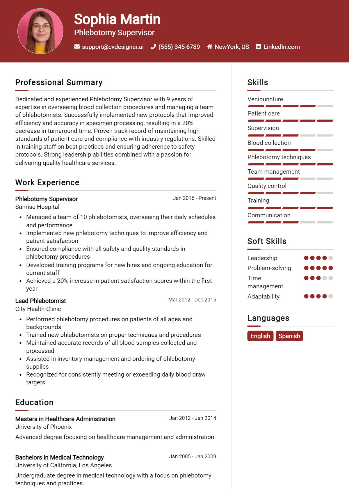 These sample resumes are designed to guide you in creating your own application as a Phlebotomy Supervisor. For further assistance and inspiration, don't forget to check out the resume templates available online, and consider utilizing cover letter examples to complement your resume and complete your job application package.